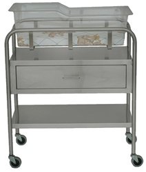 Standard Features:1- Shelf 1- DrawerBasket supports with insert bends allow basket to be moved to horizontal or elevated positionsCabinets are 20 gauge stainless steelGuard rails are .375" Mounted on 3" castersTubular framework is 1" O.D. x 16 gauge stainless steel, braced with .5" round rodsBaskets and mattresses are optional on all modelsDimensions: Overall 32" W x 36.25" H x 17" DOptional 8545 Plastic basket w/ name card is Crystal clear for maximum visibilityDimensions: Overall: 16.25" W x 9.75" H x 30" L, Inside: 12" W x 9.75" H x 26" L8546 Mattress - foam, covered w/vinyl